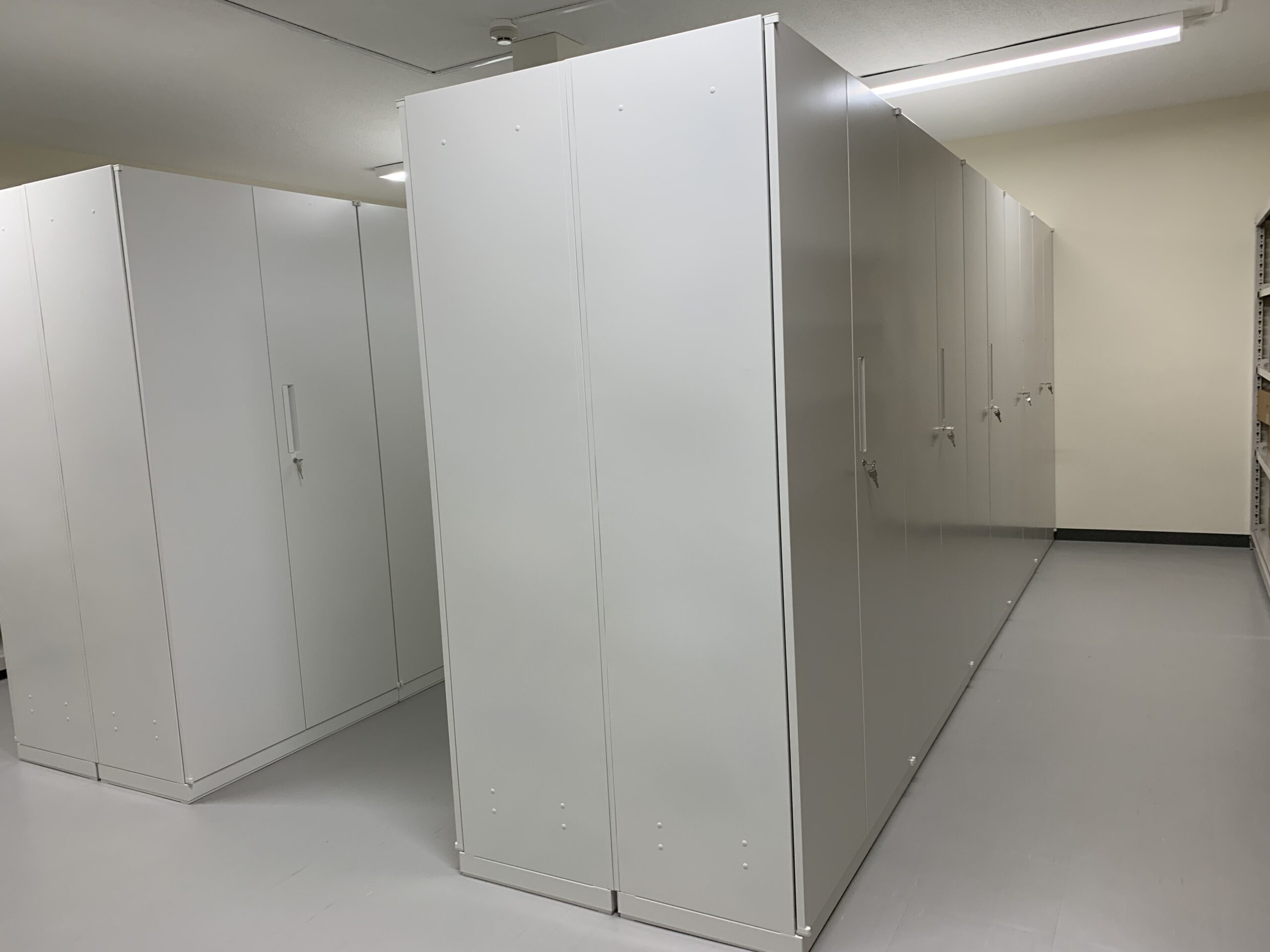 倉庫室はスペースをフル活用できるように、壁側は中軽量ラック中央は両開きの書庫の配置にしました。